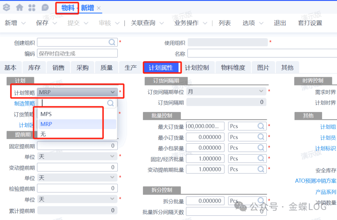在物料信息中,计划属性页签下面有一个【计划策略】字段,它的值分别包含"MPS"、"MRP" 以及 “无” 三种;那么这三种值分别表示什么意思,以及对计划运算有什么影响?通过这篇文章来详细学习。