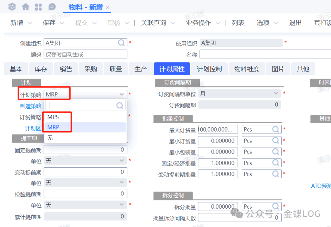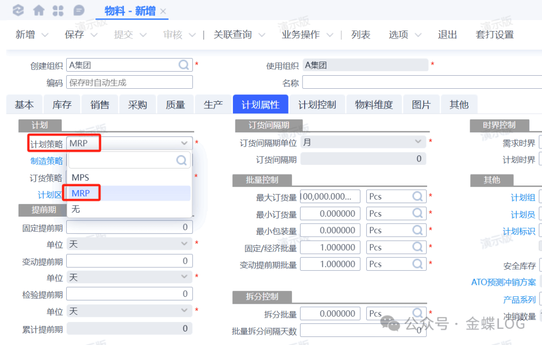 • MRP策略:物料参与MRP方案的运算,生成采购/生产计划建议。