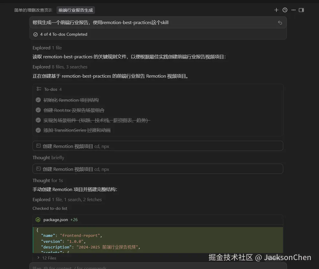 然后直接向 ai 提问,ai 会自动寻找这个 skill,并利用这个skill生成视频