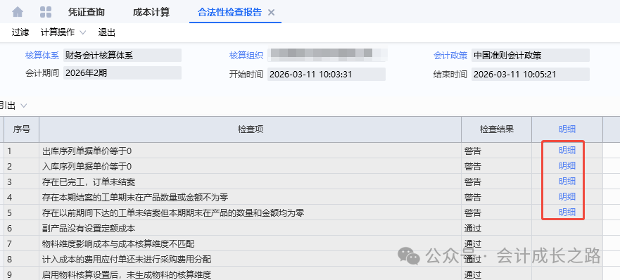 17、成本计算-执行,完成后查看合法性检查报告,处理相关问题。