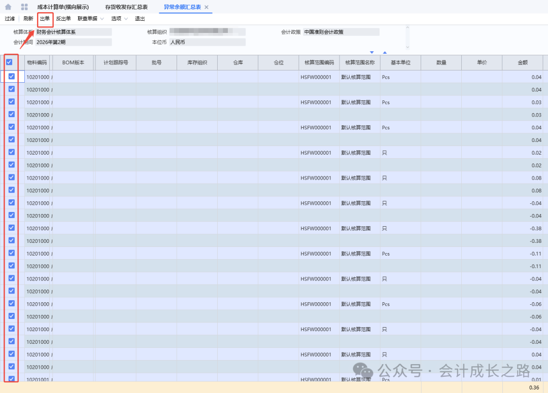 查看明细,如果物料是半成品和成品忽略,如果有外购件,需要查明原因处理;还可以先去做一遍成本计算后再做出库核算。