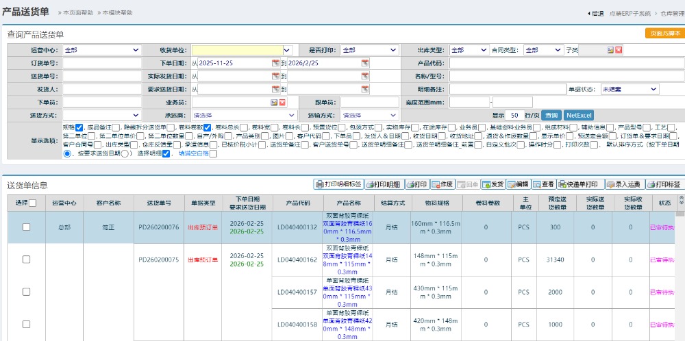 搜索需要出货的明细 可选择不同订单号的物料。选择之后如下图所示: 提交即可查询到对应的送货单;菜单为仓库管理-物料出库管理-销售出库管理-送货单明细管理:如下图所示: