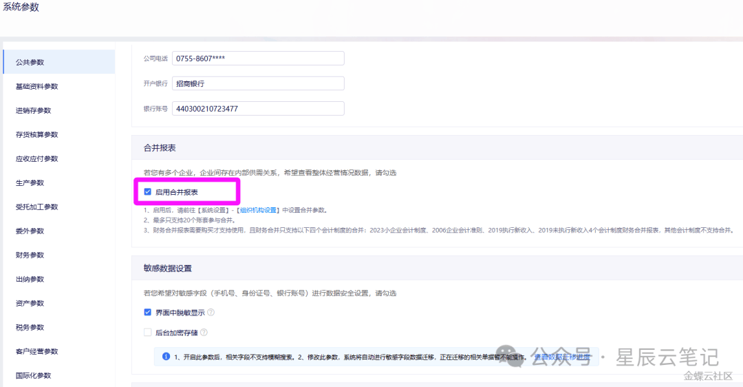 本期看点: 1、星辰财务合并报表——(1)参数设置2、星辰财务合并报表——(2)组织机构设置3、星辰财务合并报表——(3)科目映射4、星辰财务合并报表——(4)报表模板管理5、星辰财务合并报表——(5)个别报表1、星辰财务合并报表——(1)参数设置1、【系统设置】-【参数设置】-【公共参数】-【合并报表】勾选“启用合...