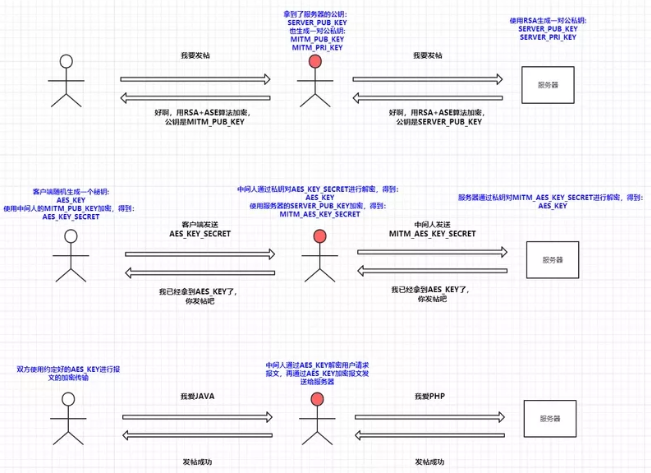 可以看到这种情况下中间人是窃取不到用于AES加密的秘钥,所以对于后续的通讯是肯定无法进行解密了,那么这样做就是绝对安全了吗?所谓道高一尺魔高一丈,中间人为了对应这种加密方法又想出了一个新的破解方案,既然拿不到AES_KEY,那我就把自己模拟成一个客户端和服务器端的结合体,在用户->中间人的过程中中间人模拟服务器的行为,这样可以拿到用户请求的明文,在中间人->服务器的过程中中间人模拟客户端行为,这样可以拿到服务器响应的明文,以此来进行中间人攻击: