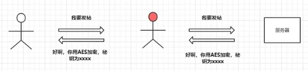 这个时候可能就有人想到了,既然内容是明文那我使用对称加密的方式将报文加密这样中间人不就看不到明文了吗,于是如下改造: