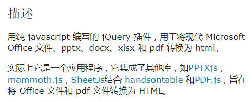 到此为止,所有的方案都被pass掉了,非常绝望。无果后,我搭上梯子,疯狂Google,终于找到了一个jquery的开源插件,叫做officeToHtml,出于对开源的尊重,这里提供一下人家的访问链接(https://officetohtml.js.org/):OfficeJs | Demos