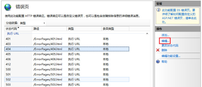 2、这样就进入了错误页面,点击【编辑】或者双击状态代码行,打开“编辑自定义错误页面”: