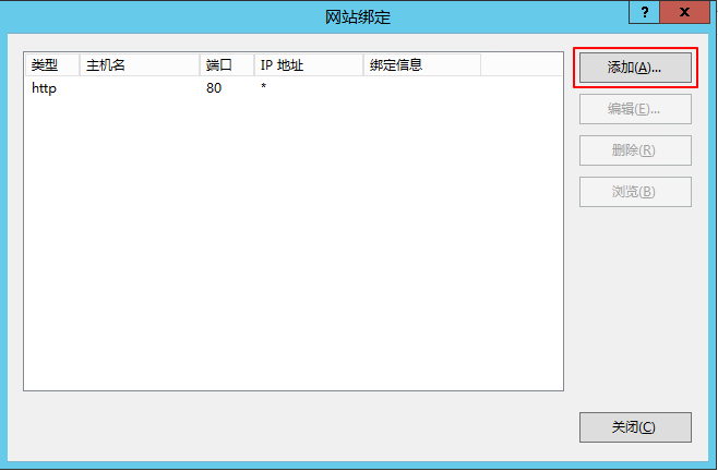 在弹出的 “网站绑定” 窗口中,单击添加。如下图所示: