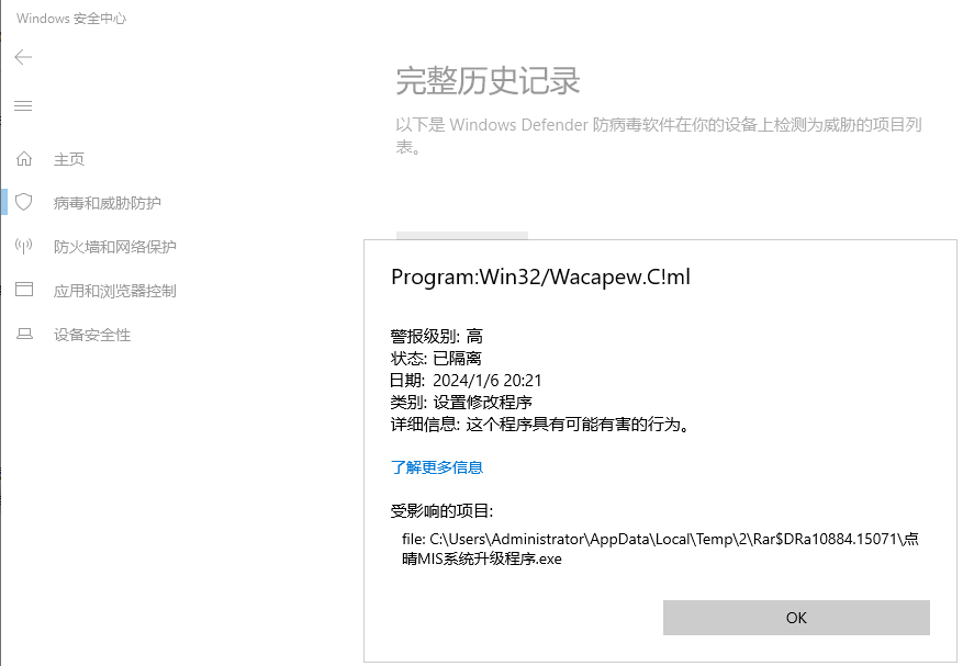 点晴MIS系统升级时Windows Defender提示检测到Program:Win32/Contebrew.A!ml病毒,如何解决?