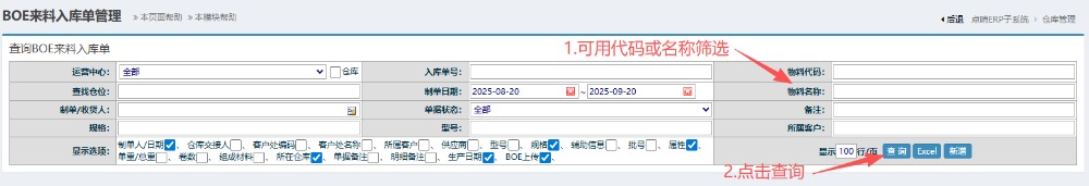 6.进入入库界面后,查询对应的BOE组件来料单,如果找不到可以通过编号和名称查找。最后点击查询。 同时有需要的话可以在下方勾选自己想要的显示选项。 ![]() 7.查询到对应订单之后,按图操作:先进行入库,再上传BOE。