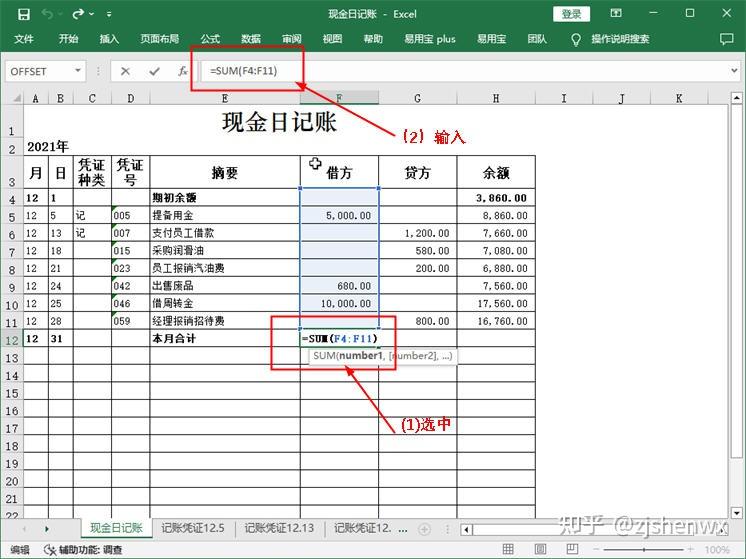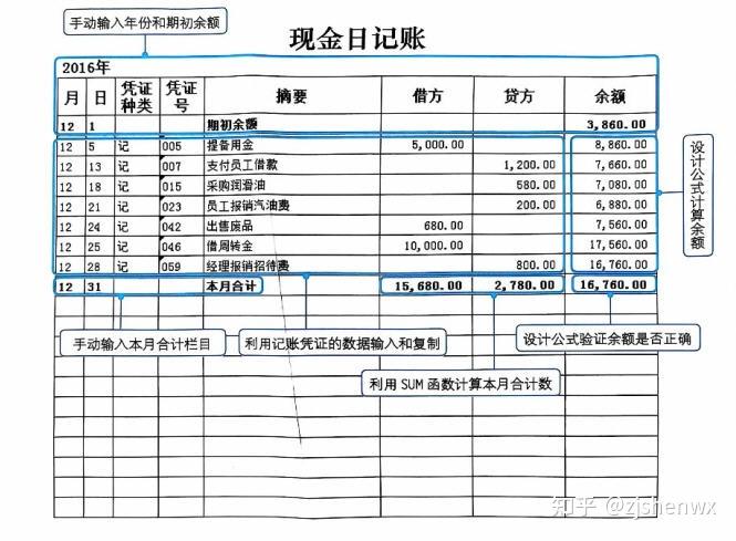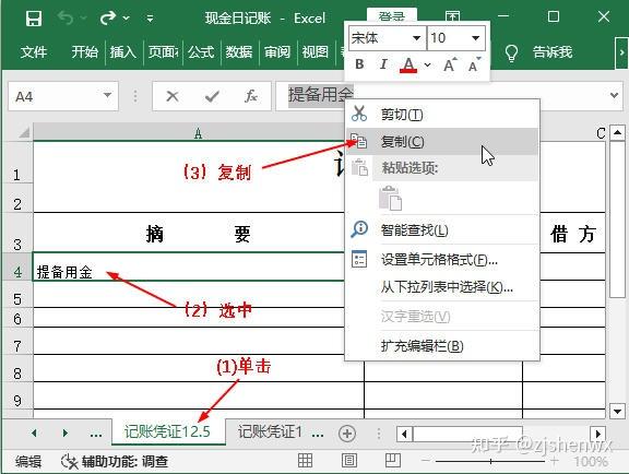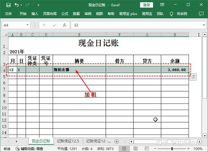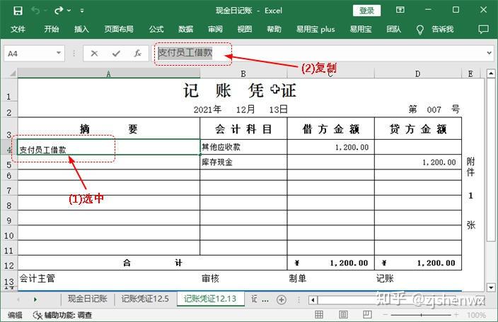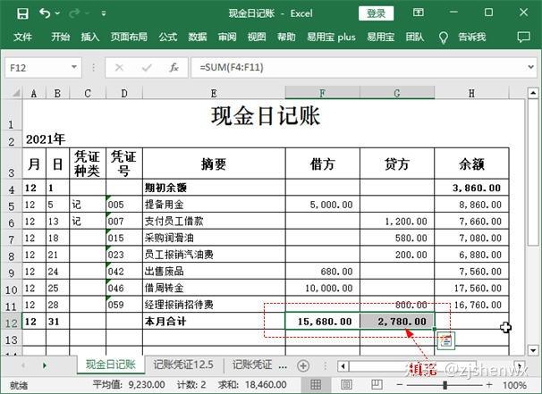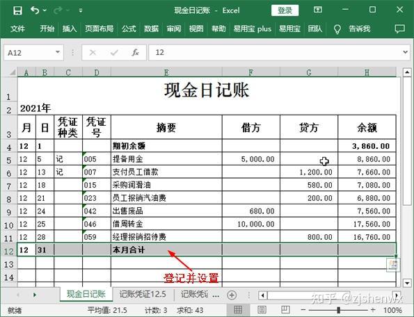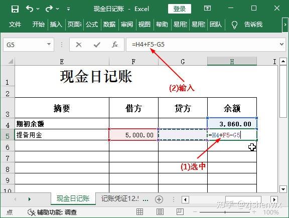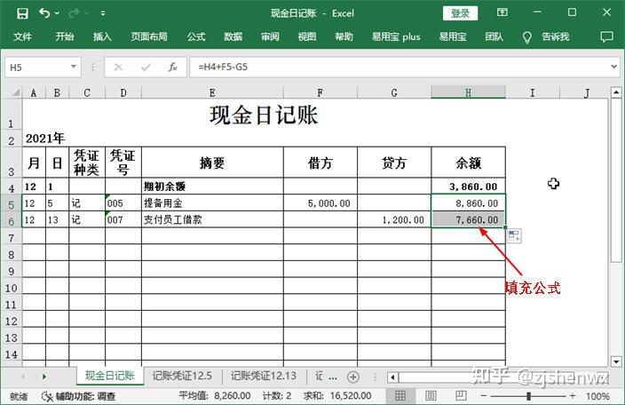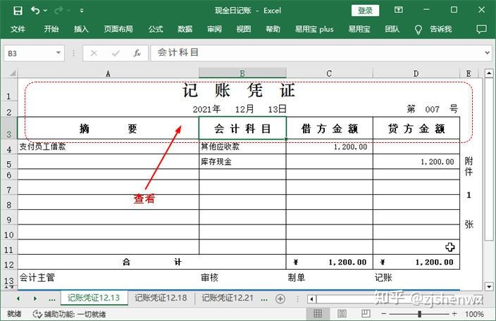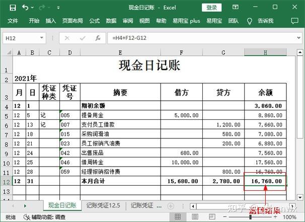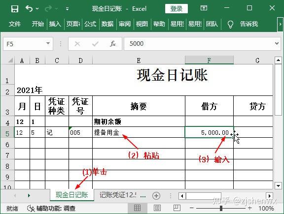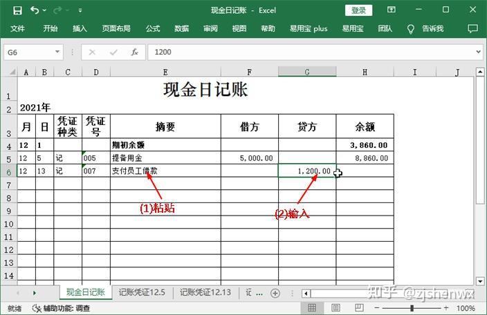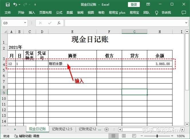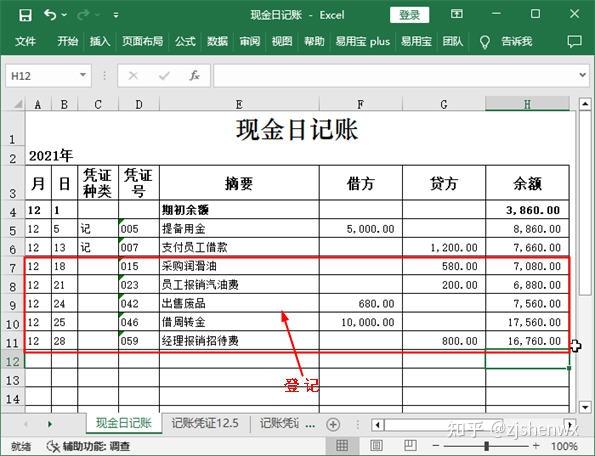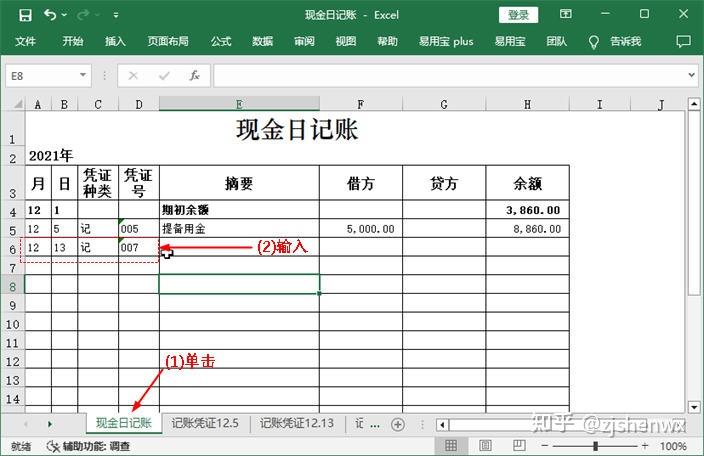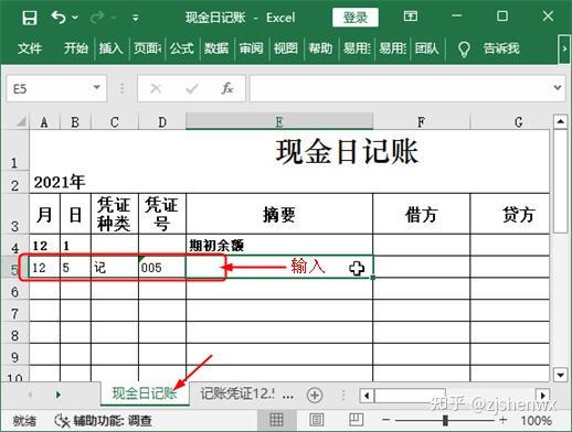 :现金日记账Excel模板的编制![]() 现金日记账Excel模板的编制根据审核后的原始凭证编制记账凭证后,同样需要对记账凭证进行审核,只有通过审核后才能作为登记账簿的依据。现金日记账是企业必须设置的一类会计账簿,现金日记账由出纳人员根据同现金收付有关的记账凭证,按时间顺序逐日、逐笔进行登记,并根据“上日余额+本日收入一本日支出=本日余额”以及“期初余额+本期增加一本期减少=期末余額”的公式,逐日结出现金余额,然后将该余额与库存现金实存数核对,以检查每日现金收付是否有误。 一、 现金日记账对现金收支情况的反映企业一般以每一个月作为一个最小的会计期间,按月登记账簿。现金日记账即是通过将所有涉及现金收支的记账凭证中的数据登记到现金日记账中,通过借方、贷方和余额等栏目,清晰表现出每一笔与现金相关的经济业务的真实情况。现金日记账账页的一般格式如下图所示。 ![]() ●年月日:每笔现金业务的发生日期,即所依据的记账凭证中的日期。 ●凭证种类:如果是通用记账凭证,一般就录入“记”字,如果是专用记账凭证,则根据情况录入“收”“付”,或“现收”“现付”等字样。 ●凭证号:所依据的记账凭证中的凭证号。 ●摘要:所依据的记账凭证中的摘要。 ●借方、贷方:如果记账凭证中库存现金的发生额在借方,那么现金日记账上也登记到借方;如果记账凭证中库存现金的发生额在贷方,那么现金日记账上也登记到贷方。 ●余额:发生每笔现金业务后,通过计算得到的现金余额。其计算公式为:本日余额=上日余额+本日借方金额-本日贷方发生额 ●期初余额:即上一个会计期间结束后剩余的现金余额。 二、 登记现金日记账并计算余额通过记账凭证是很容易完成现金日记账的登记工作的,具体做法为:找到涉及“库存现金”科目的记账凭证,将其中需要的数据抄录到账簿中,然后计算出余额即可。但对于Excel而言,如果有记账凭证表格,那么这些数据都能复制或直接引用,余额也可以通过设计公式来自动计算,这样就大大提高了工作效率。假设现金日记账的期初余额为3860元,该月发生了7 笔与现金收支相关的经济业务,下面就利于Excel来完成现金日记账的登记工作。 ![]() 1、输入年份和期初余额使用此模板登记现金日记账之前,需要手动输入该账簿所属会计期间的年份以及“库存现金”科目期初余额的数据。 【第1步】输入账簿年份 打开如下图示的“现金日记账”模板文件,选中A2单元格,在编辑栏中将“0000”修改为“2021”。 ![]() 【第2步】输入期初余额 在第4行的单元格的相应位置输入期初余额栏目的有关数据,即表示12月1日时,“库存现金”科目的期初余额为3860元。 ![]() 【第3步】加粗显示期初额 为了使期初余额的相关数据更加突出,这里可以选中A4:H4单元格区域,按【Ctrl+B】组合键将所选对象加粗显示。 ![]() 2、利用记账凭证登记现金日记账通过输入和复制记账凭证中的相关数据,可以很快完成现金日记账的登记工作。对于现金日记账余额的输入,则可手动设计公式来实现自动计算。 【第1步】查看记账凭证数据 单击“记账凭证12.5”工作表标签,查看其中有关记账凭证的日期、编号等相关数据。 ![]() (注,如何查看记账凭证的类型:记账凭证的名称就可以反映它的类型。比如名称为“记账凭证”,说明它是通用记账凭证,类型可以用“记”表示;如果名称为“收款凭证”,则类型可以用“收”表示;如果名称为“现金收款凭证”,则类型可以用“现收”表示,以此类推。) 【第2步】登记现金日记账 (1)切换到“现金日记账”工作表;(2)在第5行中依次输入所查看的记账凭证中的日期、类型和编号等数据。输入凭证号之前,应首先将单元格的类型更改为“文本”型数据。 ![]() (注:如何取消单元格左上角的绿色标识?将单元格设置为文本型数据,然后在其中输入数字时,Excel会在单元格左上角显示绿色三角标识,提醒用户这是以文本的形式存放的数字。如果确认无误,且不需要该标识,可选中单元格,单击左侧出现的按钮,在弹出的下拉列表中选择“忽略错误”选项即可。) 【第3步】复制记账凭证摘要 (1)重新切换到“记账凭证12.5”工作表;(2)选中A4单元格;(3)在编辑栏中复制摘要内容,同时记住库存现金的金额方向和金额数据。 ![]() 【第4步】在账簿中登记摘要和金额 (1)再次切换回“现金日记账”工作表;(2)选中E5单元格,在编辑栏中粘贴复制的摘要;(3)在F5单元格中输入“库存现金”科目的借方发生额。 ![]() 【第5步】设计计算余额的公式 (1)选中H5单元格;(2)在编辑栏中输入“=H4+F5-G5”,表示库存现金的本日余额=上日余额+本日借方发生额-本日贷方金额。 ![]() 【第6步】查看结果 按【Ctrl+Enter】组合键自动计算出余额的结果。 ![]() 【第7步】查看记账凭证数据 单击“记账凭证12.13”工作表标签,查看第2张记账凭证的日期、编号等相关数据。 ![]() 【第8步】登记现金日记账 (1)切换到“现金日记账”工作表;(2)在第6行中依次输入所查看的记账凭证的日期、类型和编号等数据。注意输入凭证号之前,同样需要将单元格类型更改为“文本”数据类型。 ![]() (注,事先调整单元格的数据类型:如果觉得每次输入凭证号之间都要设置数据类型太过麻烦,则可先将“凭证号”栏目下的所有空白单元格选中,将数据类型调整为“文本”型数