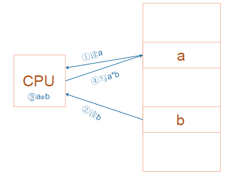 (3)举一个例子,下图是实现这样的乘法运算:a = a * b。它需要4个步骤:读出a的值、读出b的值、相乘、写结果到a。