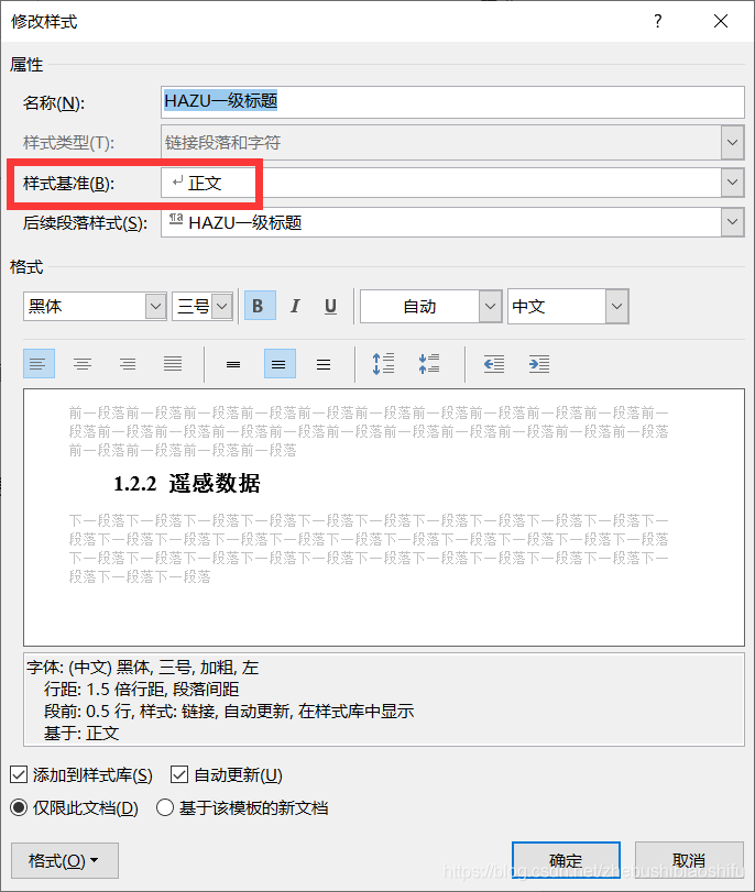 然后将一级标题的“样式基准”修改为新建的“没有缩进”。